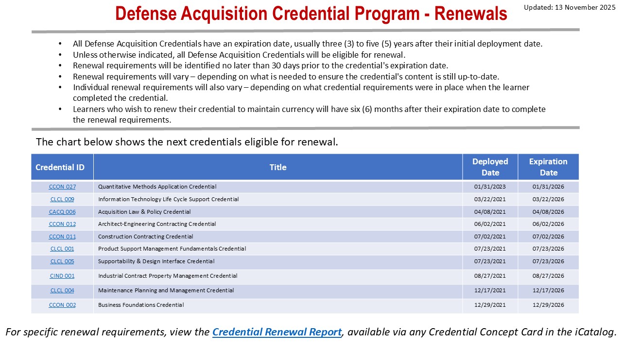 Defense Acquisition Credentials provide the knowledge and associated skills needed to perform job-centric, niche, and/or emerging functions in the defense acquisition environment. They are intended to enhance specific skills and improve performance in the workplace. Whether you manage capability requirements, acquire services/systems, or sustain capabilities, earning credentials can build your competence, confidence, and value to your organization and the DOD.