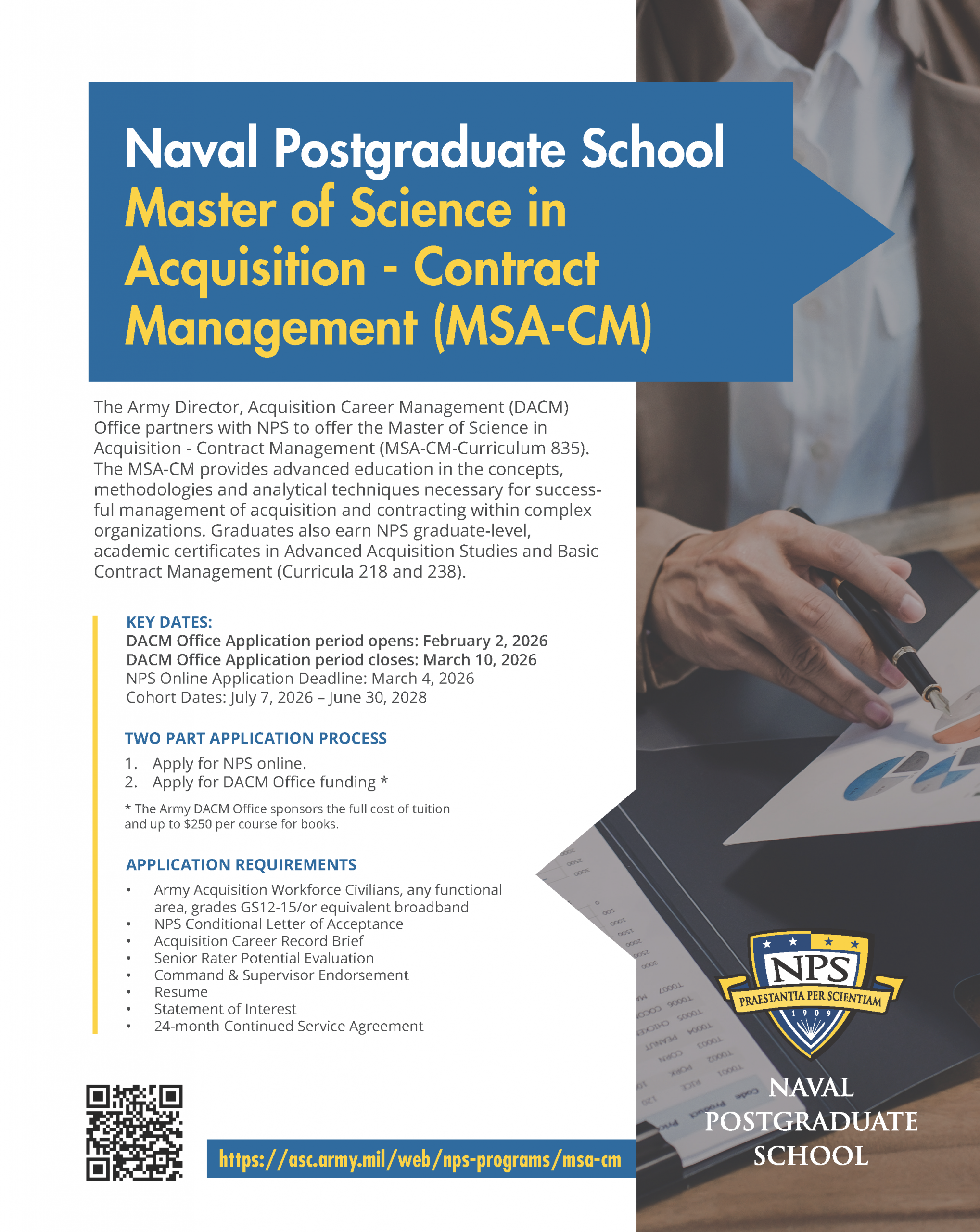 NPS Conditional Letter of Acceptance: Applicants must upload into AAPDS a copy of the NPS Conditional Letter of Acceptance obtained by NPS admissions. NPS online admissions application must be completed no later than 4 March 2026. You must meet all NPS academic requirements and Army DACM eligibility requirements to participate in the program if you should be selected for participation by the Army DACM Office. After you submit your NPS online application, NPS Admissions will email you a “Conditional Letter of Acceptance” to acknowledge you have applied for the MSA-CM.