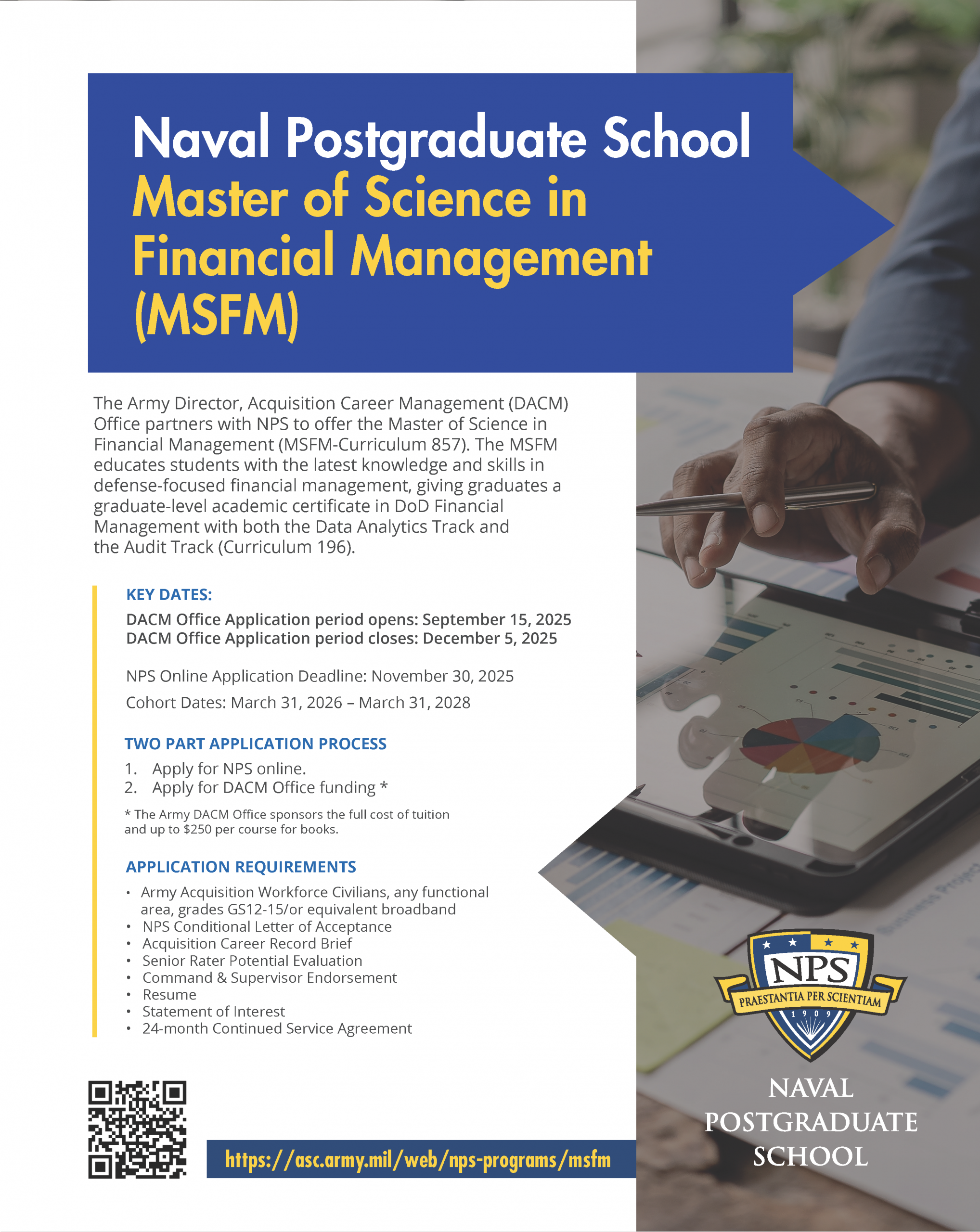 - NPS Conditional Letter of Acceptance: Applicants must upload into AAPDS a copy of the NPS Conditional Letter of Acceptance obtained by NPS admissions. NPS online admissions application must be completed no later than 30 November 2025. You must meet all NPS academic requirements and Army DACM eligibility requirements to participate in the program if you should be selected for participation by the Army DACM Office. After you submit your NPS online application, NPS Admissions will email you a “Conditional Letter of Acceptance” to acknowledge you have applied for the MSFM.